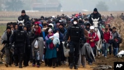 在警察的陪同下,难民们穿过斯洛文尼亚的边界(2015年10月27日)。